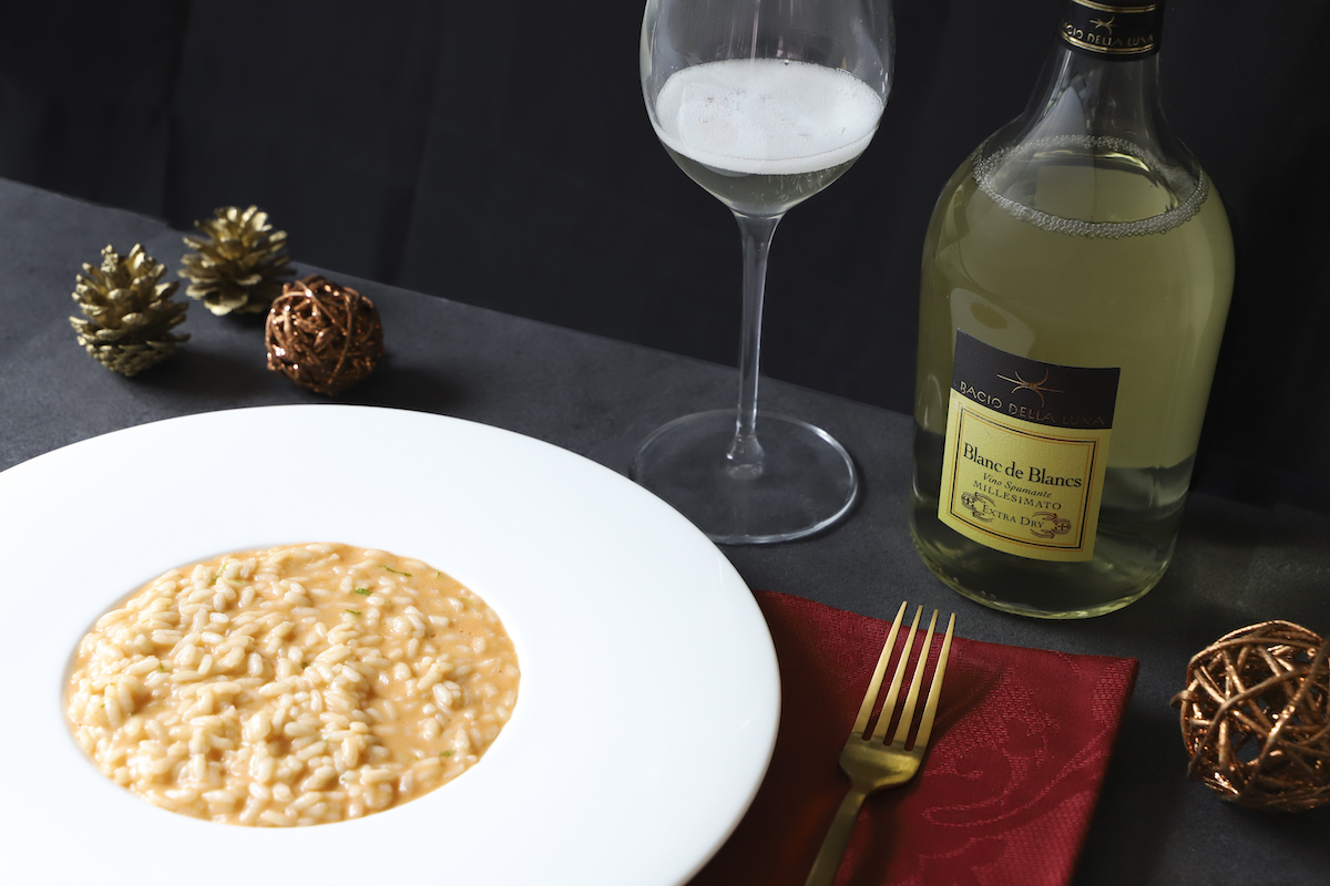 Per prepararci a pranzi e cene delle feste di Natale abbiamo stappato una bottiglia speciale di bollicine e trovato l’abbinamento ideale per gustarla. Il vino è un Blanc de Blancs Extra Dry della cantina veneta Bacio della Luna, mentre il piatto che lo accompagna è un risotto ai gamberi opera di Stefano De Gregorio, alias Chef Deg.
