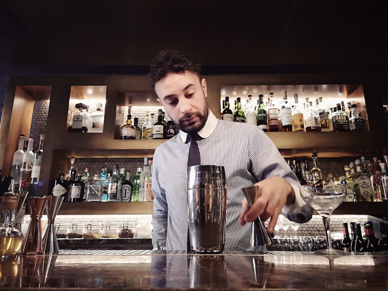 - In uno shaker Parisienne versare il VII Hills Italian Dry Gin, lo shrub al kiwi, il succo di mezzo lime, l’H-Theoria Perfidie e due/tre dash di Sea Water (o soluzione salina), per aumentare la sapidità degli ingredienti.