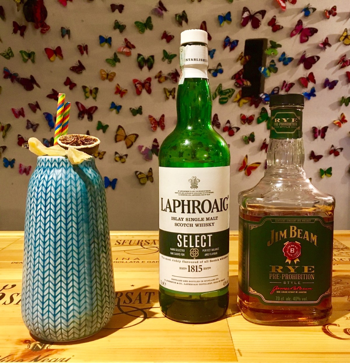 - 3 cl spiced whisky mix (di cui tre parti di Jim Beam Rye Whiskey alla cannella e una parte di Laphroaig Select whisky)